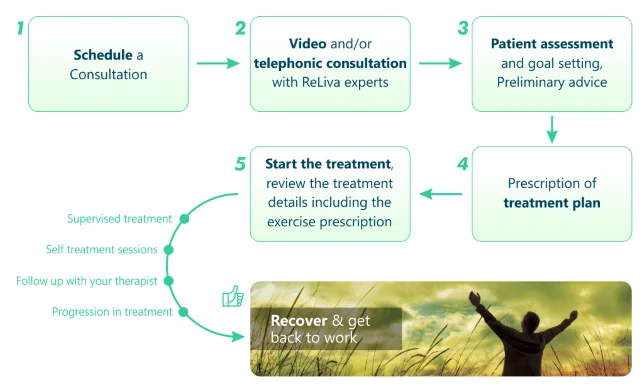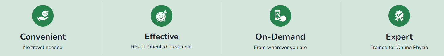An easy step by step flow of how online physiotherapy works. Start with booking a convenient appointment, have a video consultation with physiotherapist, understand your treatment plan, continue with video physiotherapy sessions that monitor your recovery, progress your treatment with physiotherapy exercises as it would, otherwise in a physiotherapy clinic.